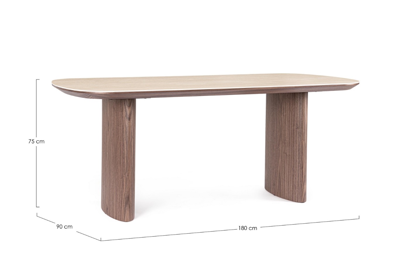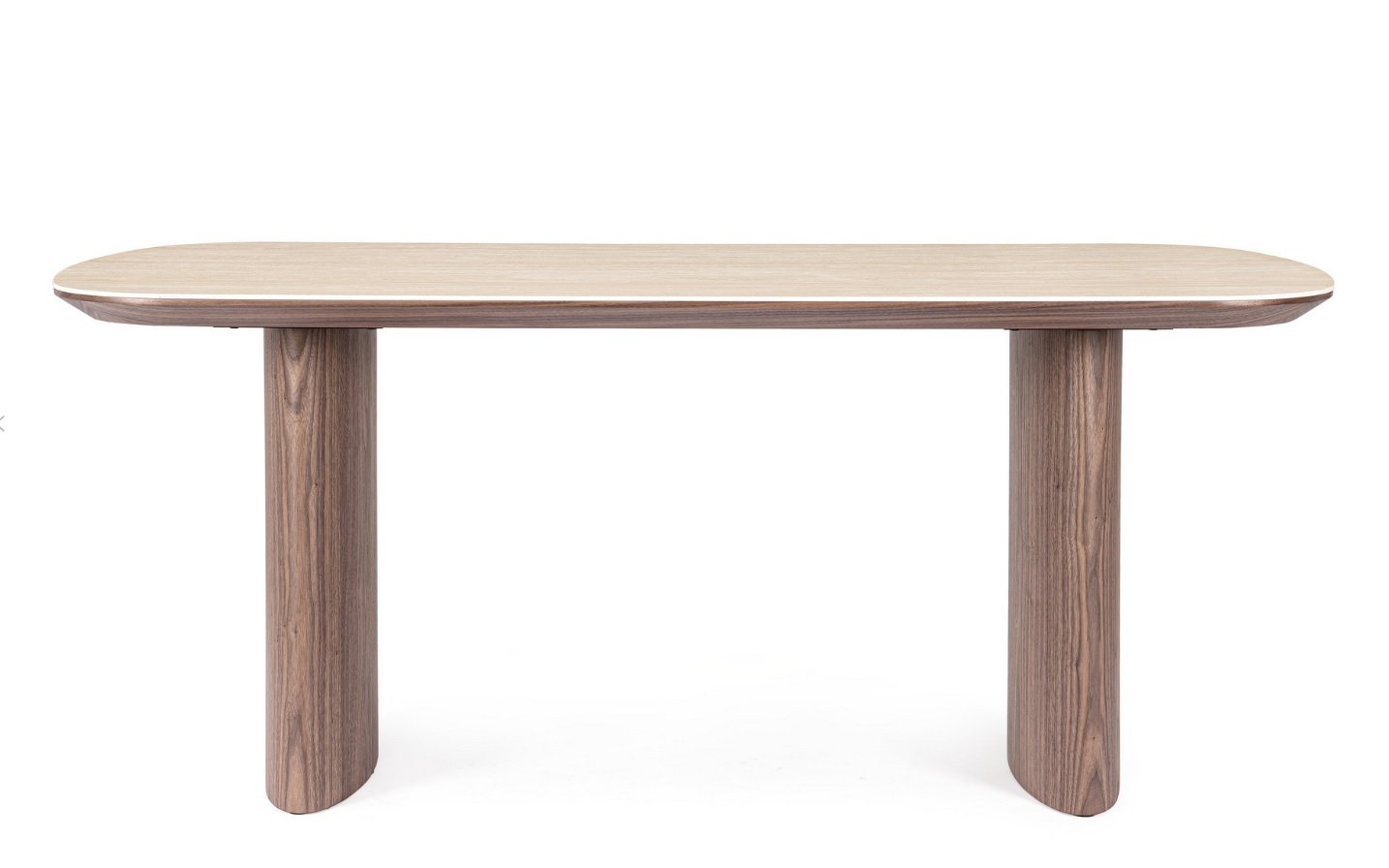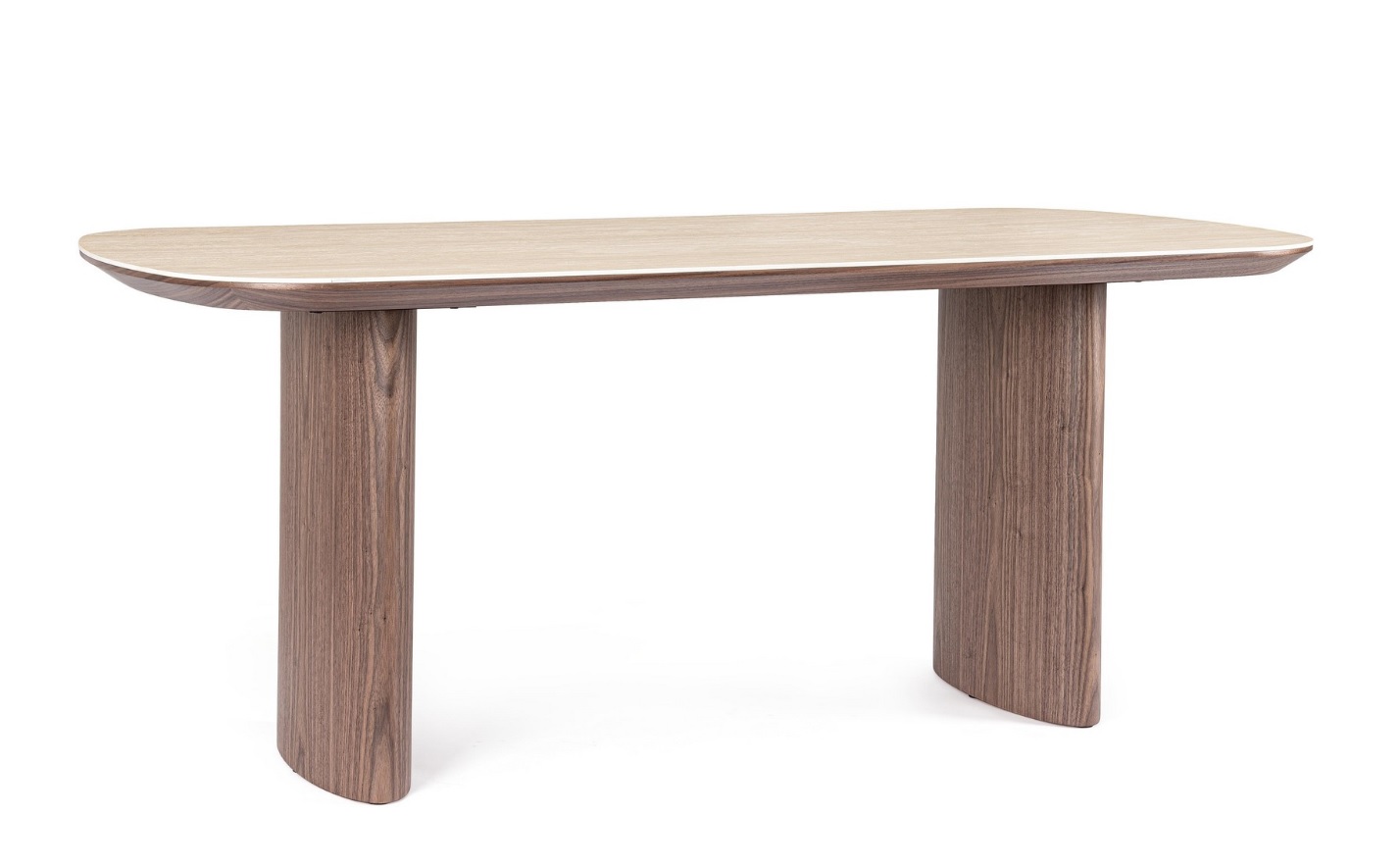 Stół Ezekiel to atrakcyjny mebel. Nie tylko pięknie się zaprezentuje, ale także spełni swoją praktyczną funkcję w kuchni, jadali czy salonie. Jego dzielona kolorystyka nadaje mu wyjątkowego uroku. Stół posiada konstrukcję i nogi zrobione z drewna orzechowego fornirowanego płytą mdf. Wykończony jest farbą poliuretanową. Jego blat wykonano ze spiekanego kamienia (naturalnego kamienia poddanego obróbce w wysokiej temperaturze) z efektem trawertynu.