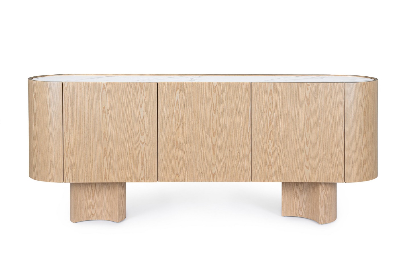 Trzydrzwiowa komoda Otilia to uniwersalny element wyposażenia, gdyż znajdzie zastosowanie w wielu pomieszczeniach takich jak sypialnia, salon, przedpokój czy pokój młodzieżowy. Jego jasna kolorystyka ładnie połączy się z wieloma kolorami wykończeń. Jej konstrukcja została wykonana z fornirowanej płyty mdf, blat jest z spieku kamiennego. Produkt posiada poliuretanowe wykończenie. Komoda posiada otwierane drzwi z cichym domykiem, za którymi umieszczone są półki. Jest to propozycja dla osób poszukujących wielofunkcyjnych, praktycznych mebli, wyróżniających się oryginalnym designem.